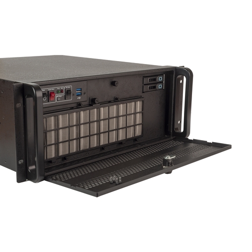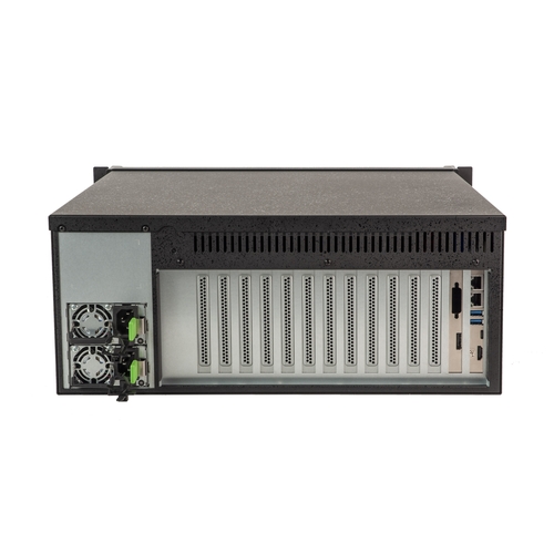 The VWP-111XR is a 4U Rackmount Chassis with (x11) Slots of PCIe card capacity, an Intel E3 Xeon processor, Windows 10 LTSC Operating System, 32GB RAM, (x2) 240GB SSD Storage (RAID Configured), and an 800W redundant power supply. It includes local HDMI and DisplayPort outputs for connection of a local control screen, and a variety of USB ports for connectivity.