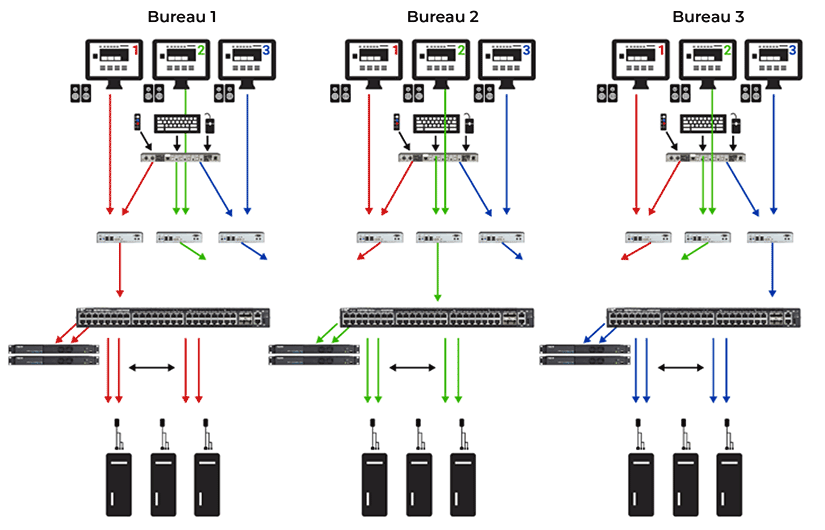 To accommodate the customer's need for more computer and user ports, Black Box experts recommended Agility, a KVM over IP system that supports VGA and digital video. While it doesn't support the strict requirements of a TEMPEST Secure KVM Switch, Agility can be configured with strict user access rights and routes, which allowed the customer to also separate the servers with confidential information from the public systems.